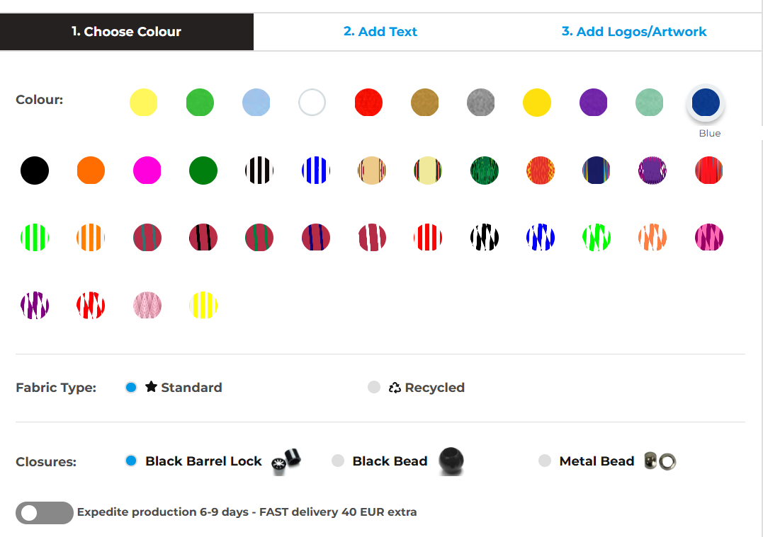 Start by picking your base colour—there are over 40 vibrant colour options to match your brand, event, or theme. Next, choose your fabric type. You can go with the standard sublimated polyester material or opt for an eco-friendly recycled option if sustainability is a priority.