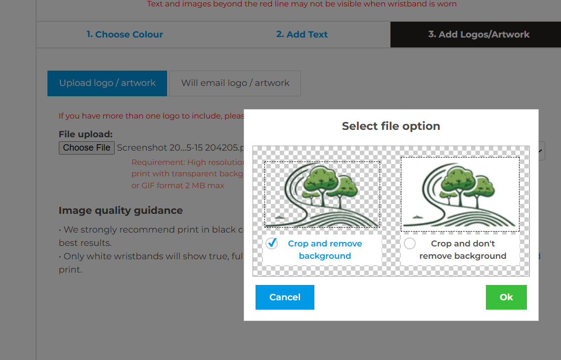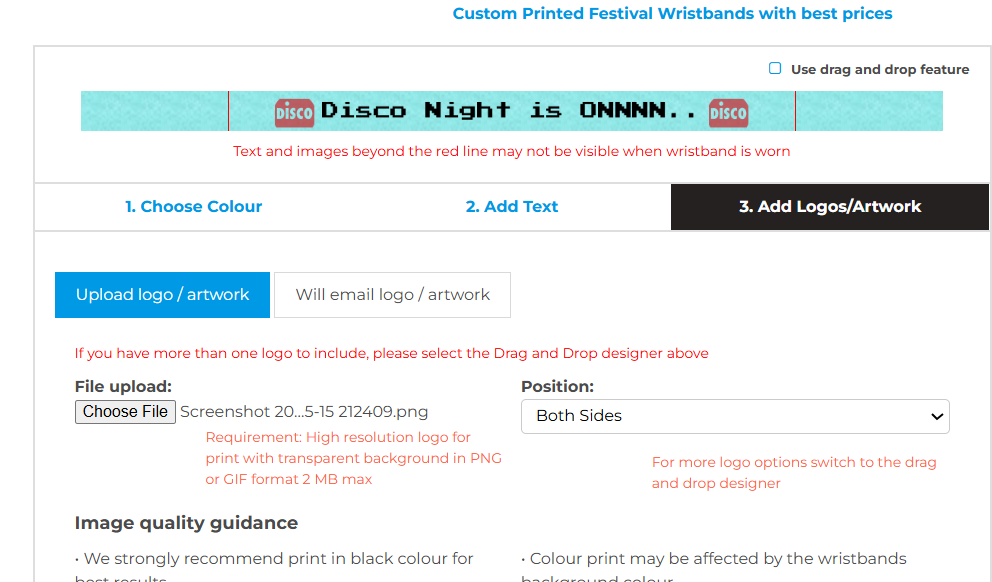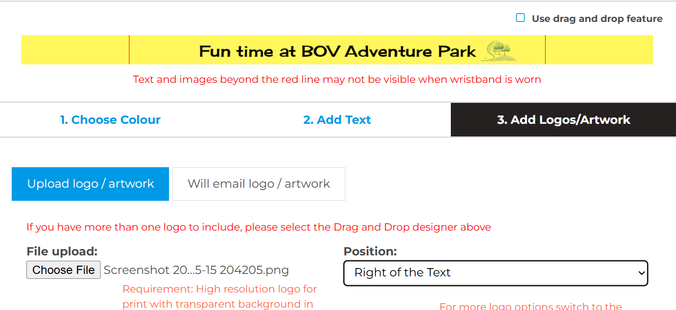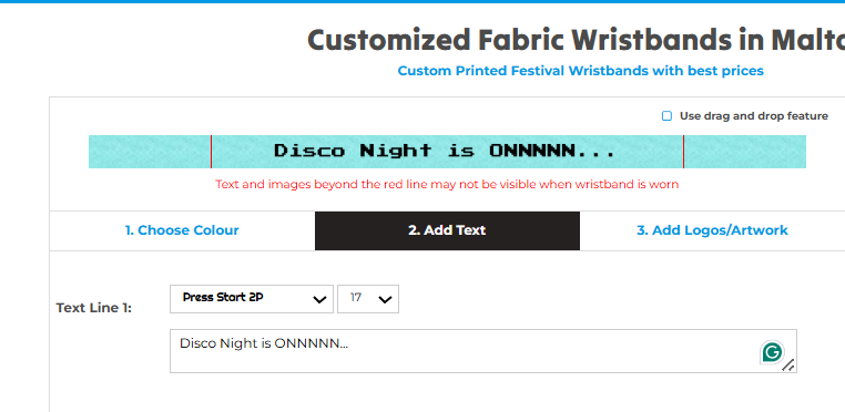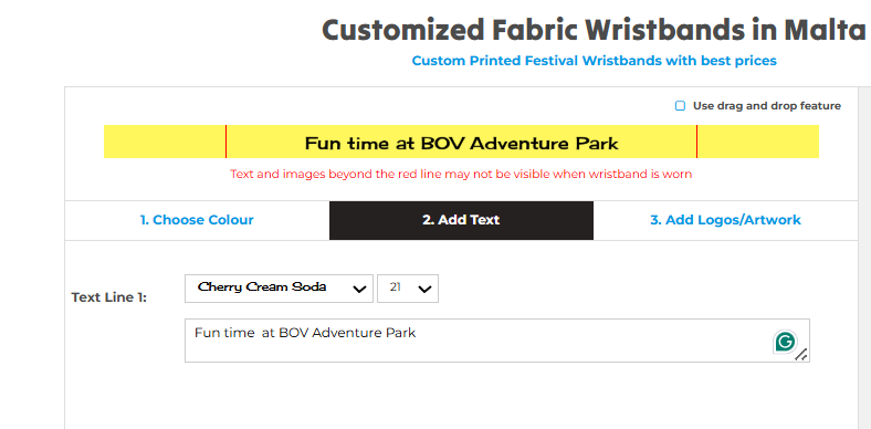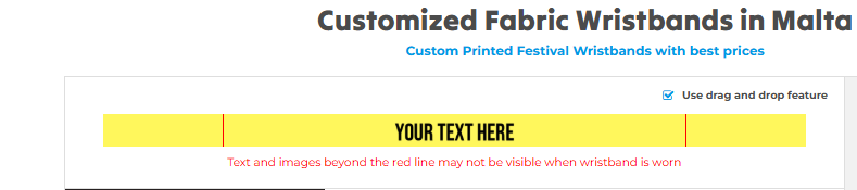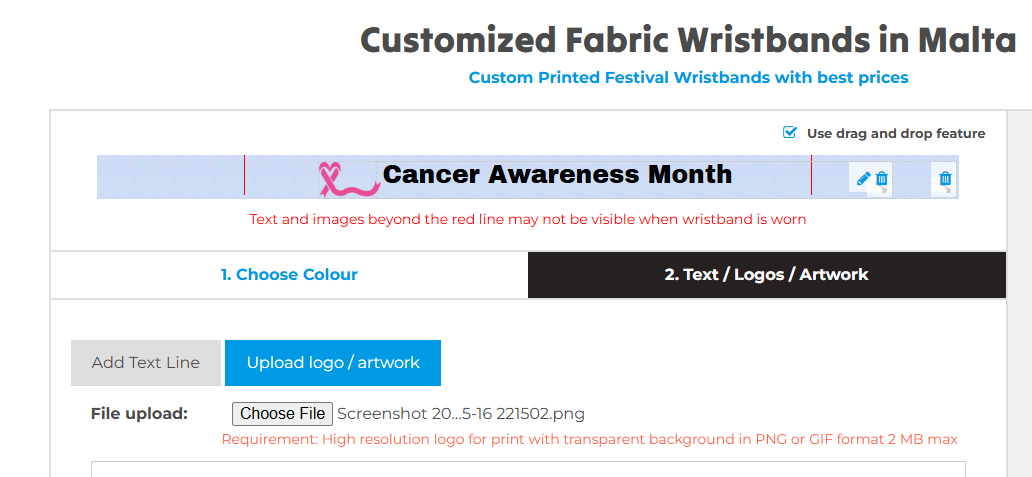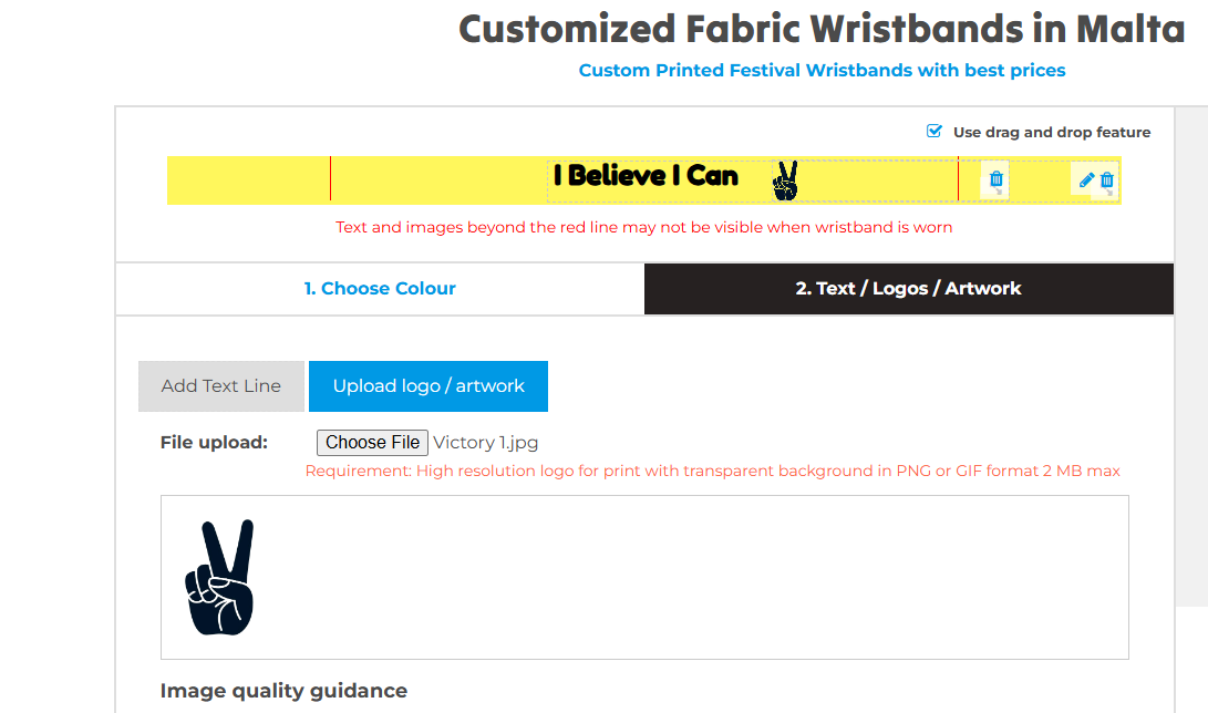 Add a visual element to make your wristbands stand out. You can either upload your logo or artwork directly, or if it’s easier, email it separately to us at info@maltawristbands.com. Make sure your design is high-resolution for the best quality weave. Additionally, you can select the position of the artwork or logo.